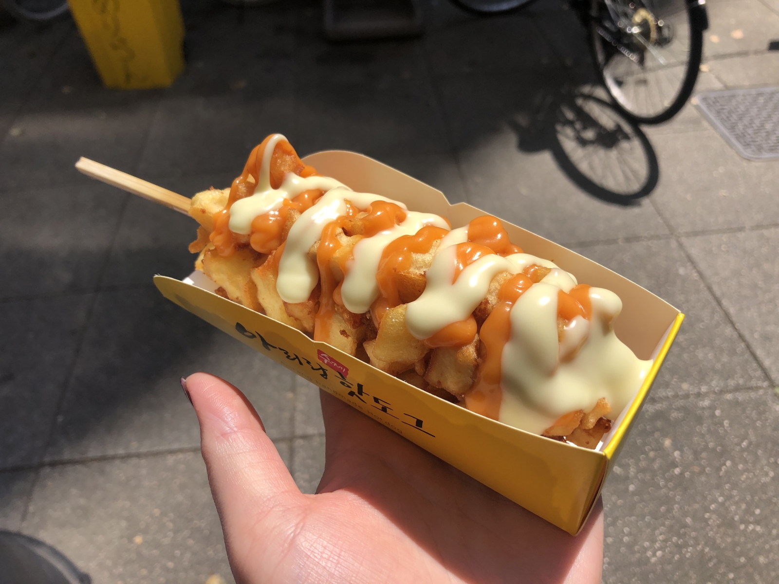 こんにちは😊中﨑です🐭 少し前から流行ってるチーズドッグを アメ村で食べてきました😋 ポテトレーラと