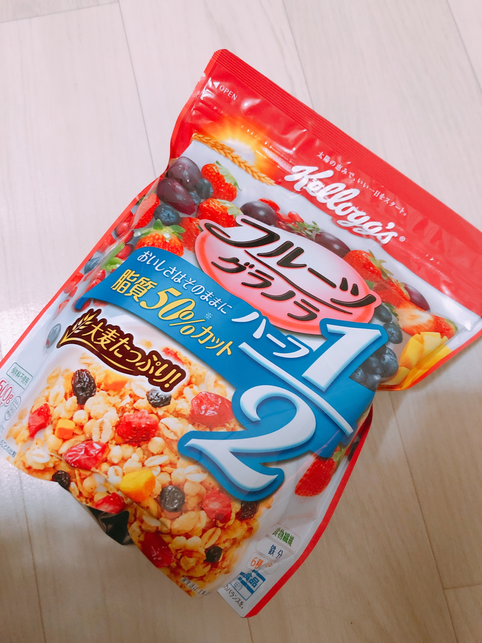 こんにちは🌟 辻中です。 最近フルーツグラノラ を 食べてます🎉 パッケージの通り 脂質50%カット