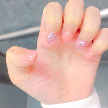 前職がスーパーのレジ社員で念願のネイルなので爪を整えてもらう最中まで迷ってましたが、初めてなのでピンク系で、私の希望でホログラムも入れてもらいました(❁´ω`❁)