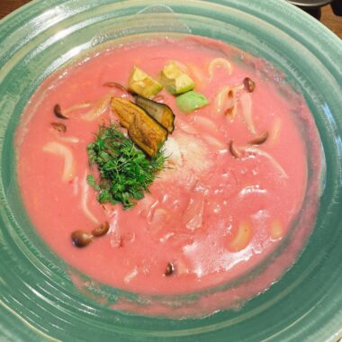ビーツを使ったカルボナーラうどんらしく